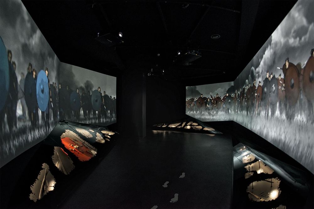 Videoinstallationen Slaget er en stemningsfuld og intens fortolkning af et voldsomt slag med flere tusinde kæmpende krigere, der fandt sted i Illerup Ådal i omkring år 200.