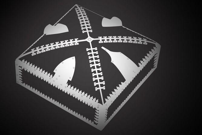 Skrinet er ca. 32x32 cm stort, er bygget af træ - sandsynligvis egetræ - med beslag på hjørner, sider og top og med en fin låsemekanisme. Flere steder er der tegn på at beslagene er sølvbelagte. Langs siderne og fra hjørnerne og op over låget til top-beslaget sidder der fine nitter.